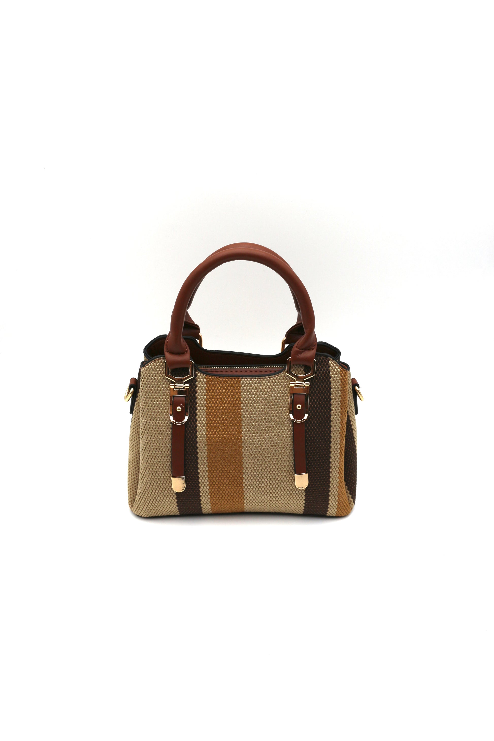 Chic, structured, and effortlessly bold — the Sienna Satchel Bag makes a statement without saying a word. Featuring a woven body with warm earth-toned stripes, leather accents, and polished gold hardware, it’s the perfect blend of texture and sophistication. Compact yet spacious enough for your essentials, this satchel transitions seamlessly from everyday errands to evening plans.